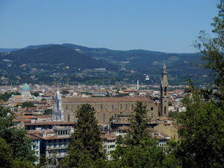 Salimos del Palazzo Vecchio y nos dirigimos tras Napoleón y los duques de la Toscana, hacia las galerías Uffizi para coger el corredor cubierto que lleva al puente Vecchio. Atravesamos el puente Vecchio y vamos andando hasta los jardines Bordini. La subida a los jardines es a pie, lo que nadie esperaba es que fuera un monte tan pronunciado. Bajo el calor de la tarde (que además el domingo fue el día de más calor en Florencia) y los ropajes de corte, la subida por el camino a la parte alta de los jardines, fue complicada, agotadora y casi hasta mortal. En la subida vi a más de un inglés o ruso rojo como un tomate, sin respiración y buscando la sombra de algún árbol. Las ropas de corte no eran las más adecuadas para ese paseo. Sé que cuando se pensó en ello fue porque la subida, aunque en continua pendiente, va descubriendo hermosas vistas de Florencia. En una de las curvas de la cuesta, entre las hojas de los árboles se podía ver la cúpula del duomo al fondo. Y cuando nos acercamos a la villa donde comeríamos hermosos jardines escalonados brillaban bajo el sol de la toscana.