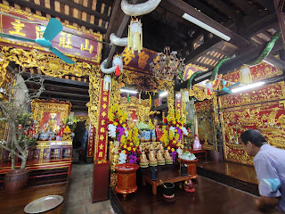 Una vez dentro del edificio hay que subir unas escaleras y pasar de uno muy deprisa y en silencio con las manos pegadas al cuerpo. Había mujeres llorando al pasar junto al cuerpo, para mi es como ver una estatua ya que no significa nada. A la salida los guardias que había salieron de su pose para ayudar a los ciegos a bajar las escaleras, cuando el de abajo subió a relevar al otro guardia el guardia volvió a su puesto corriendo. Y así fueron turnándose para ayudarlos a bajar las escaleras. Una vez fuera nos dejaron tiempo libre junto a la pagoda del pilar único, como nosotras ya habíamos estado nos acercamos al templo que hay al lado para verlo, curiosamente tiene un cerezo en flor dentro del templo, y un cartel con los diferentes karmas existentes. De aquí nos marchamos al templo de la literatura. El interior está distribuido en hasta cinco patios o pabellones a los cuales se va accediendo a través de diferentes puertas. Nada más entrar te encontrarás en un primer patio rodeado de jardines, lo más destacable de este patio es sin duda la gran puerta (Đại Trung Môn) que da acceso al siguiente, coronada por carpas Koi. El tejado a base de ladrillos de color rojo, está sujeto por robustos pilares de madera que conforman tres puertas diferentes. Aquí pudimos encontrarnos con un grupo de estudiantes con su bonete de graduación, muy apropiado para la historia del lugar.