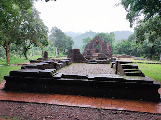 Nada más bajarnos del coche en el aparcamiento de My Son nos dirigimos a la entrada y cruzamos un puente hasta una parada donde cogemos un tren eléctrico como en la pagoda de Baih Dinh. Aparte de que nos ahorra tiempo el cielo está completamente nublado por lo que, aunque hasta ahora nos hemos salvado, hay altas probabilidades de que llueva. El complejo tiene un recorrido circular y los lugares están clasificados con letras (Complejo A, B, D…) ya que es así como lo clasificaron los franceses en su momento. El primer complejo es el que más edificios tiene y el que están mayoristamente en estado original (el resto de complejos tienen más reconstrucción). Pese a la posible lluvia hay bastante gente viendo el lugar.
